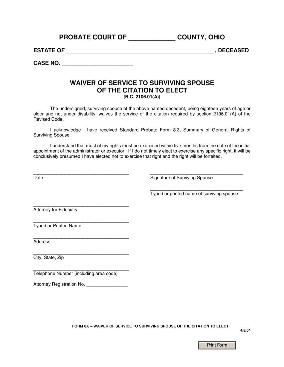 Form 8 6 Download Fillable Pdf Or Fill Online Waiver Of Service To Surviving Spouse Of The Citation To Elect Ohio Templateroller